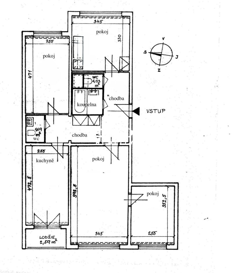 Byt je dispozičně řešen jako prostorná vstupní chodba. Z chodby je vstup do koupelny se sprchovým koutem, na samostatné WC,2. samostatné WC s komorou, do ložnice, pokoje a do obývacího pokoje, z kterého je vstup do dalšího pokoje. Z chodby je dále vstup do kuchyně a z ní do zasklené lodžie.